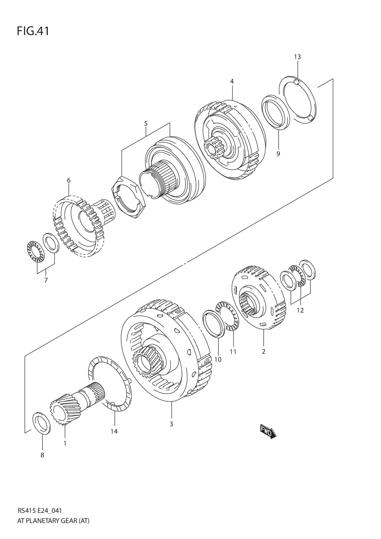 FIG.30 MT CLUTCH CONTROL (MT:LHD)FIG.31 MT CLUTCH CONTROL (MT:RHD)FIG.32 MT TRANSMISSION GEAR (MT:RS413)FIG.33 MT TRANSMISSION GEAR (MT:RS415)FIG.34 MT GEAR SHIFT FORK (MT:RS413)FIG.35 MT GEAR SHIFT FORK (MT:RS415)FIG.36 TRANSMISSION CASE (MT:RS413)FIG.37 TRANSMISSION CASE (MT:RS415)FIG.38 AUTOMATIC TRANSMISSION (AT)FIG.39 AT OIL PUMP (AT)FIG.40 AT INPUT SHAFT (AT)FIG.41 AT PLANETRAY GEAR (AT)FIG.42 AT REDUCTION GEAR (AT)FIG.43 AT FWD/REVERSE CLUTCH (AT)FIG.44 AT 2ND BRAKE (AT)FIG.45 AT 1ST/REVERSE BRAKE (AT)FIG.46 AT OVER DRIVE BRAKE (AT)FIG.47 AT TRANSMISSION CASE (AT)FIG.48 AT PARKING BRAKE (AT)FIG.49 AT VALVE (AT)FIG.50 AT OIL COOLER HOSE (AT)FIG.51 GEAR SHIFT CONTROL (MT)FIG.52 GEAR SHIFT CONTROL (AT)FIG.53 AT SELECT LEVER (AT:LHD)FIG.54 AT SELECT LEVER (AT:RHD)FIG.55 DRIVE SHAFT (RS415:MT)FIG.56 DRIVE SHAFT (RS415:AT:E12:~JSAEZC21S001095)FIG.57 DRIVE SHAFT (SEE NOTE)FIG.58 FRONT DIFF GEAR (MT:RS413)FIG.59 FRONT DIFF GEAR (MT:RS415)FIG.60 FRONT DIFF GEAR (AT)