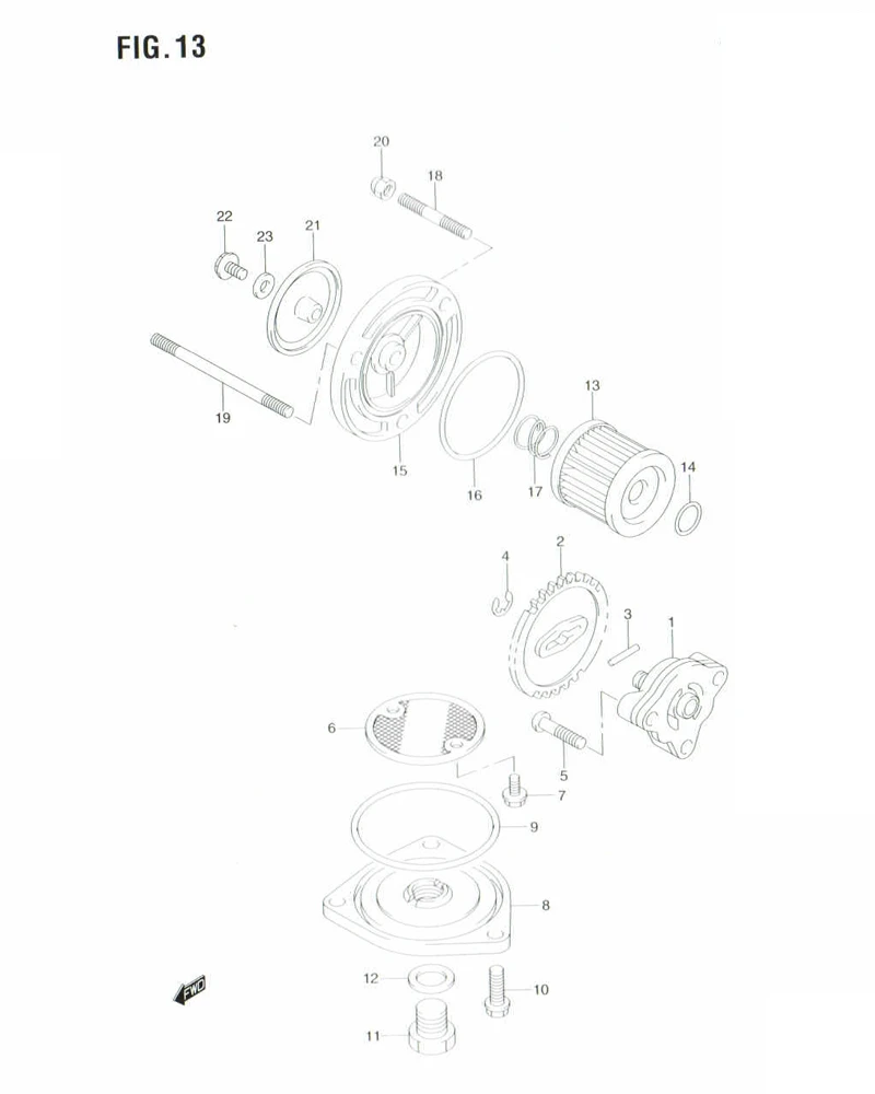 FIG. 46 FRONT MASTER CYLINDERFIG. 1 GASKET SETFIG.2 CYLINDER HEADFIG. 3 CYLINDERFIG. 4 CRANKCASEFIG. 5 CRANKCASE COVERFIG. 6 CRANKSHAFTFIG. 7 STARTER CLUTCHFIG. 8 CAM SHAFT - VALVEFIG. 9 CAM CHAINFIG. 10 CARBURETOR (MODEL K5)FIG. 10A CARBURETOR (MODEL K6/K7)FIG. 11 AIR CLEANERFIG. 12 MUFFLER (MODEL K5)FIG. 12A MUFFLER (MODEL K6/K7)FIG. 13 OIL PUMPFIG. 13A 2ND AIR (MODEL K6/K7)FIG. 14 CLUTCH (FL125RCDM)FIG. 15 TRANSMISSIONFIG. 16 GEAR SHIFTINGFIG. 17 KICK STARTERFIG. 18 STARTING MOTOR (DAICHOKOU)FIG. 19 STARTING MOTOR (DENSO)FIG. 20 MAGNETOFIG. 21 BATTERYFIG. 22 ELECTRICALFIG. 23 SPEEDOMETER (MODEL K5/K6)FIG. 23A SPEEDOMETER (MODEL K7)