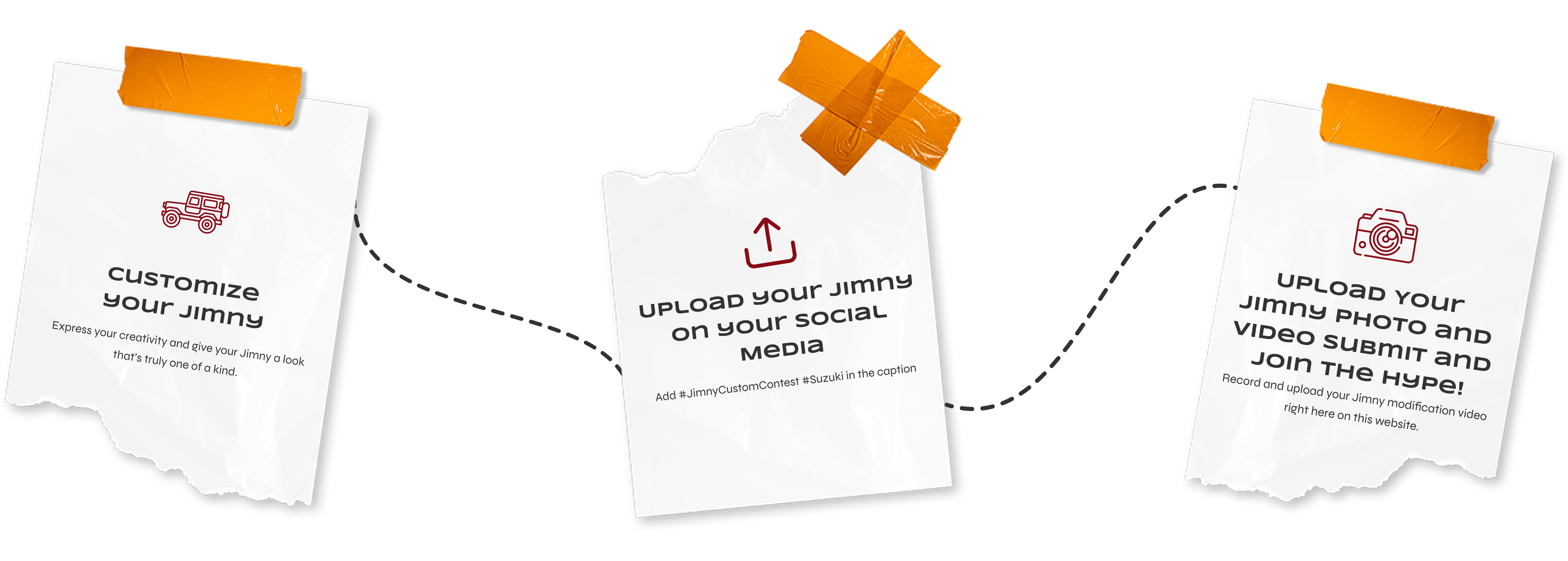PARTICIPATE NOW!Join the Jimny Custom Contest and get the chance to win amazing rewards such as a Trip to Japan, Drone & Smartwatch, and even an Action Cam!