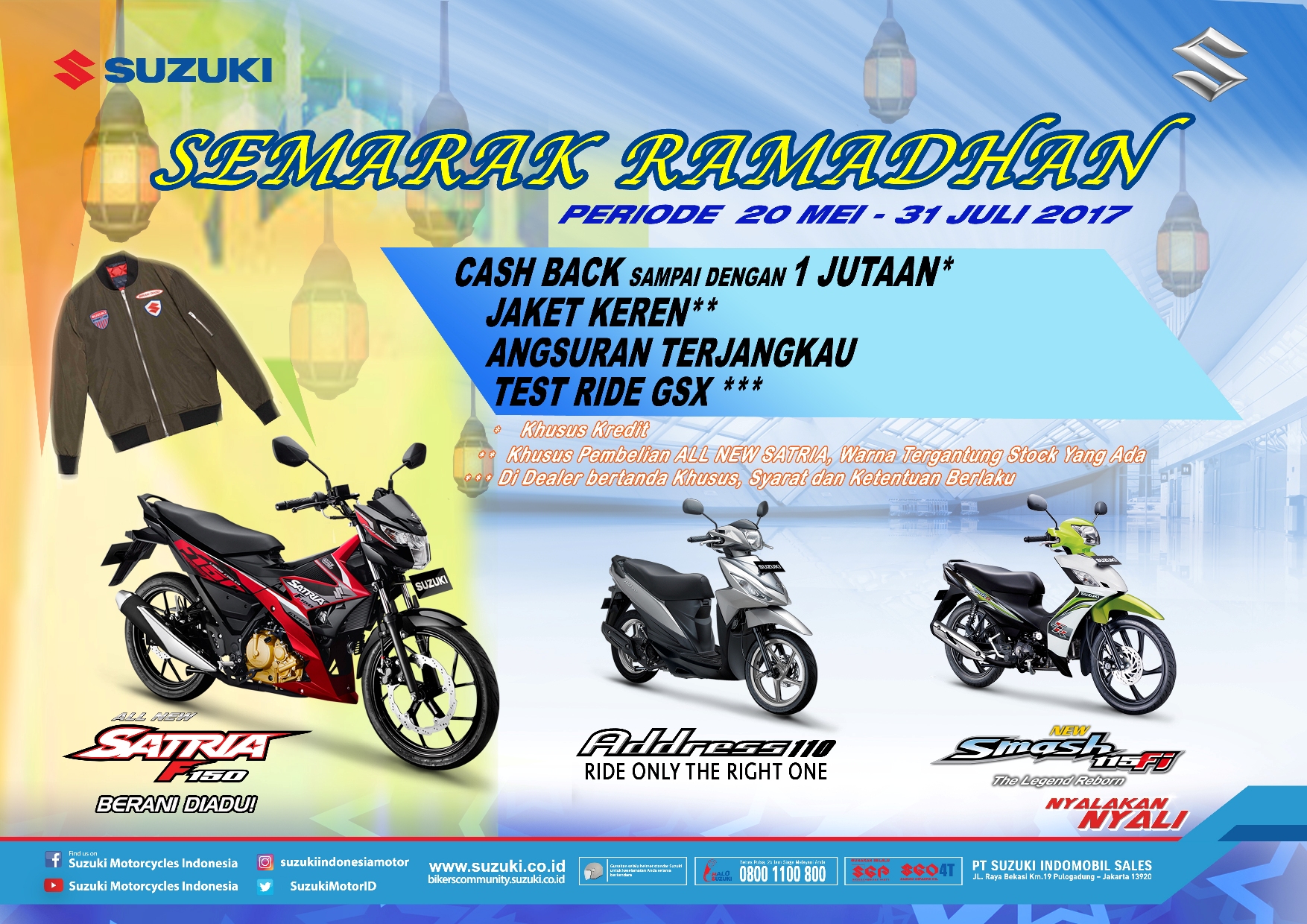 Jakarta, 19 Mei 2017 Dalam rangka menyambut bulan Ramadhan dan Hari Raya Lebaran yang tidak lama lagi berlangsung, PT. Suzuki Indomobil Sales (SIS) mengeluarkan program menarik dan penuh berkah untuk calon konsumen sepeda motor Suzuki di Tanah Air dengan nama Suzuki Semarak Ramadhan. Program penuh keuntungan ini berlangsung dari tanggal 20 Mei hingga 31 Juli 2017.